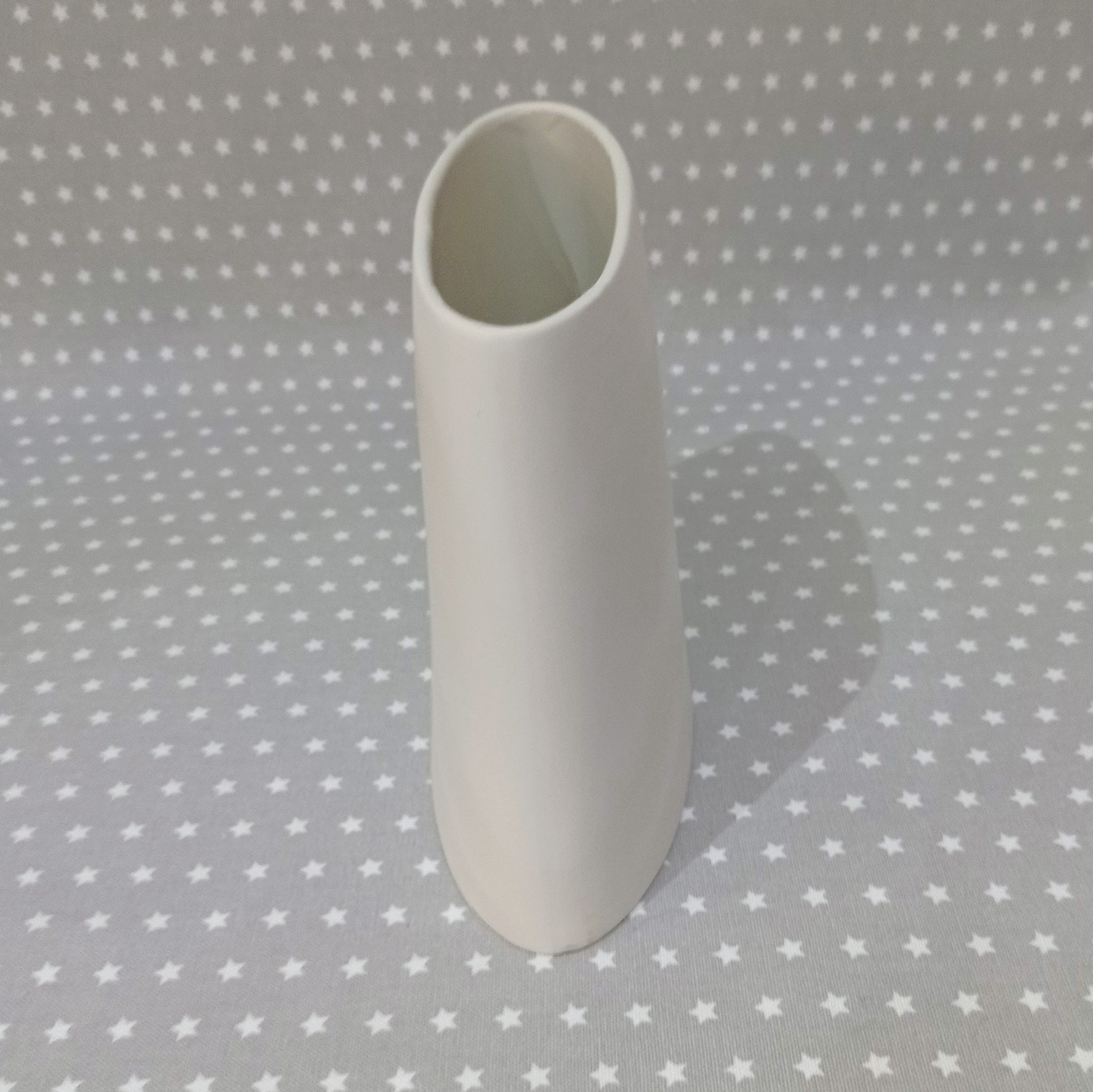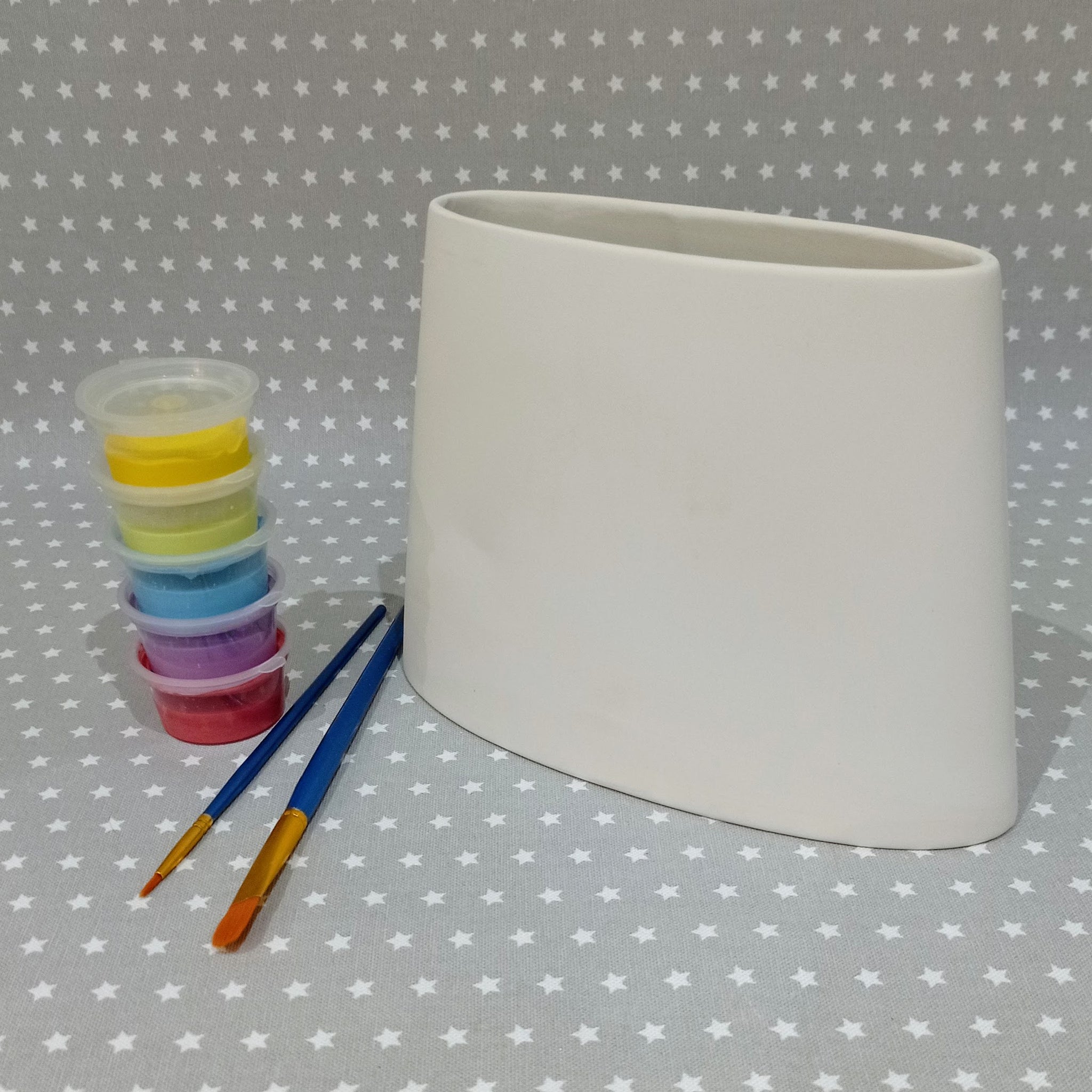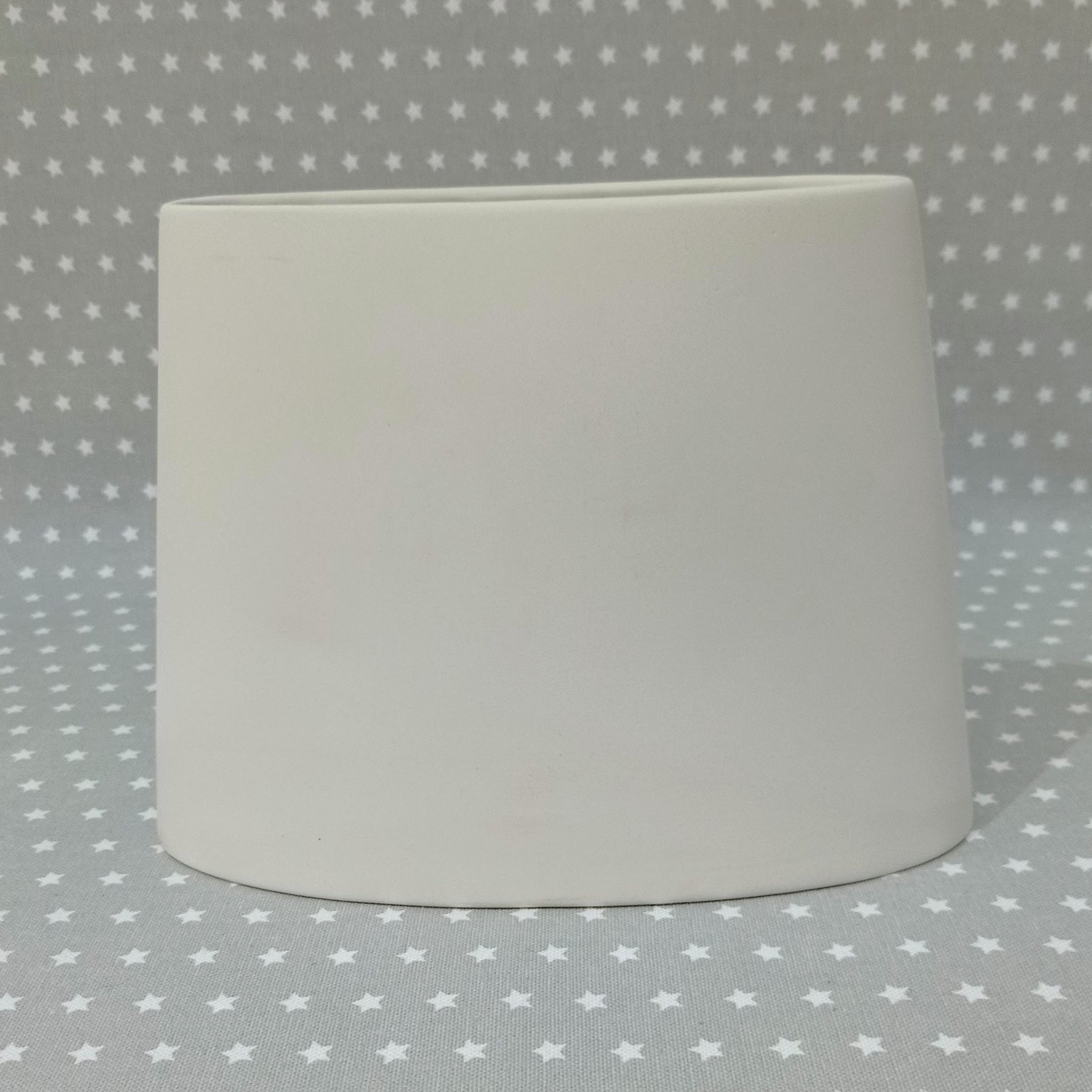 This Oval Slanted Vase will look great when painted with your own unique design. It's the perfect size for baby hand and footprints too.