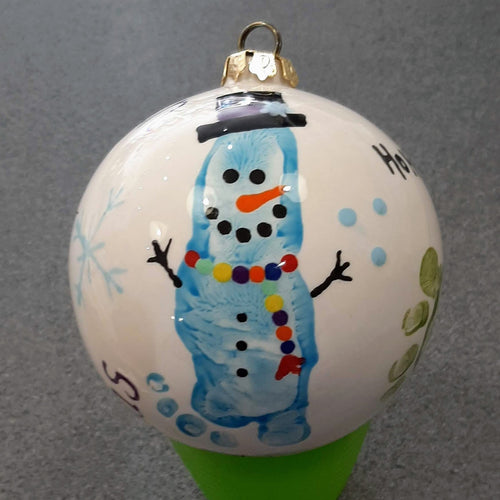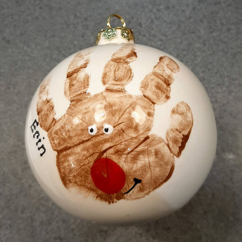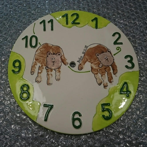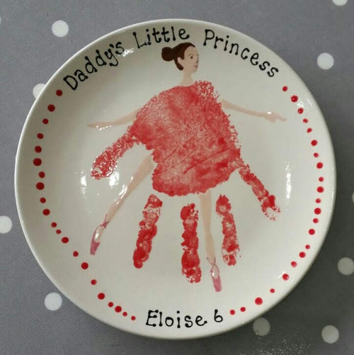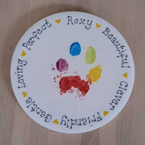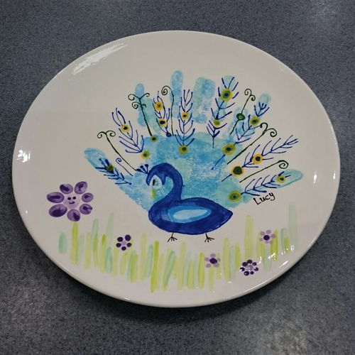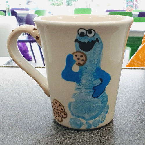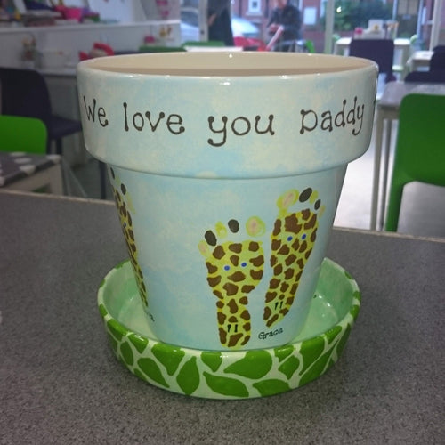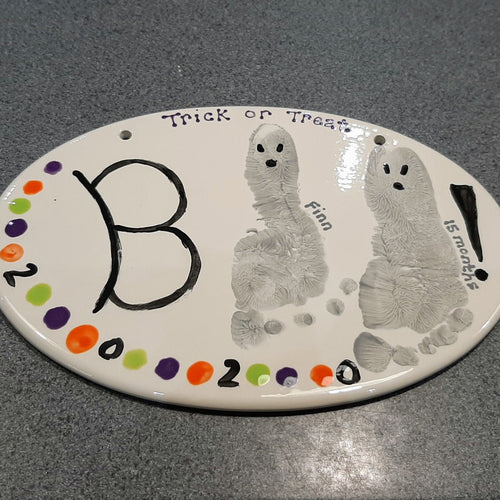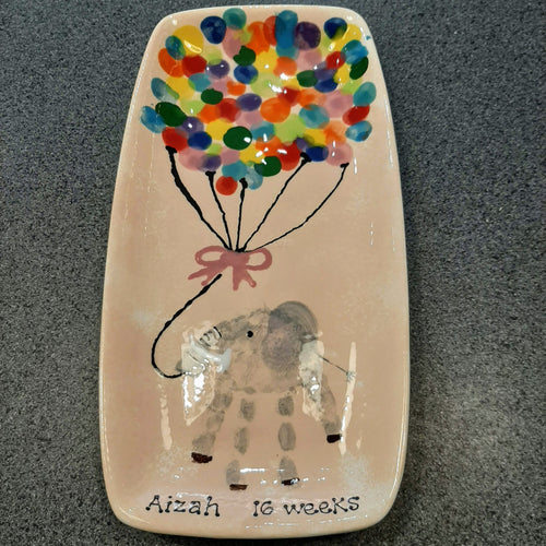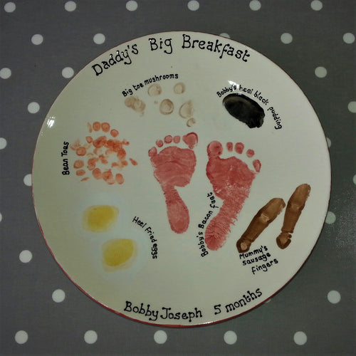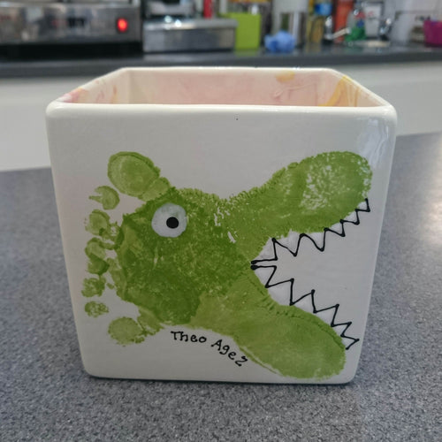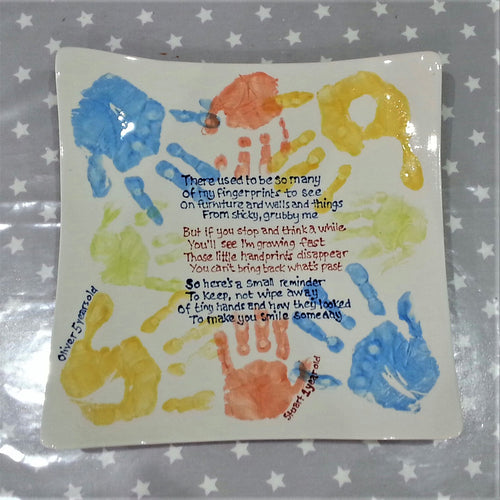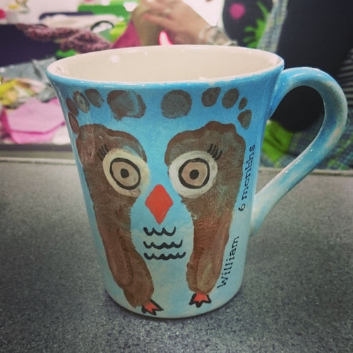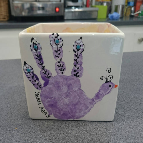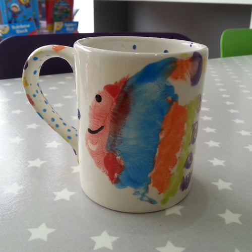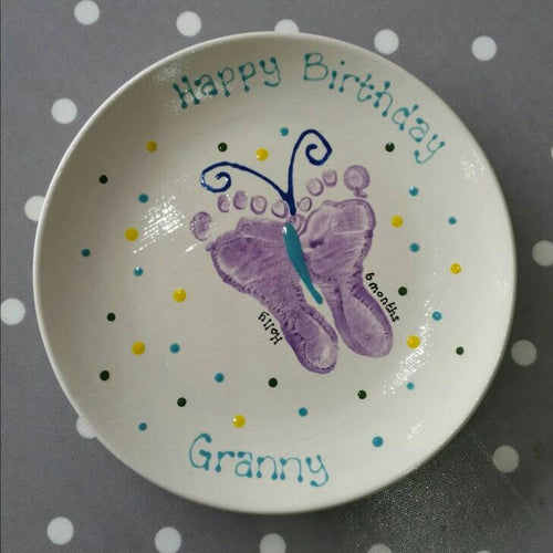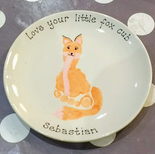You may have painted your pottery with a pale coloured background before the prints were taken or you may decide to decorate around the prints once they are safely on the pottery - spots or patterns around the edge are popular. Or why not turn your prints into a cheeky monkey, elephant or other animal. If you’d prefer, we can complete the art work for you, once the prints have been taken, for a small charge. Equally effective is keeping it simple by just adding a name and age and letting the prints shine.