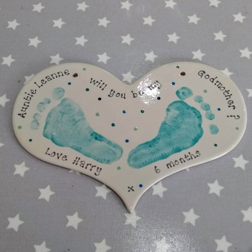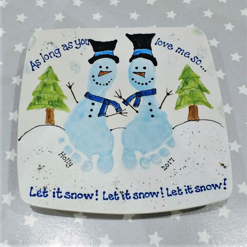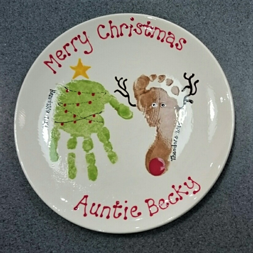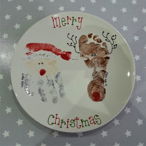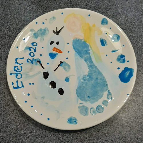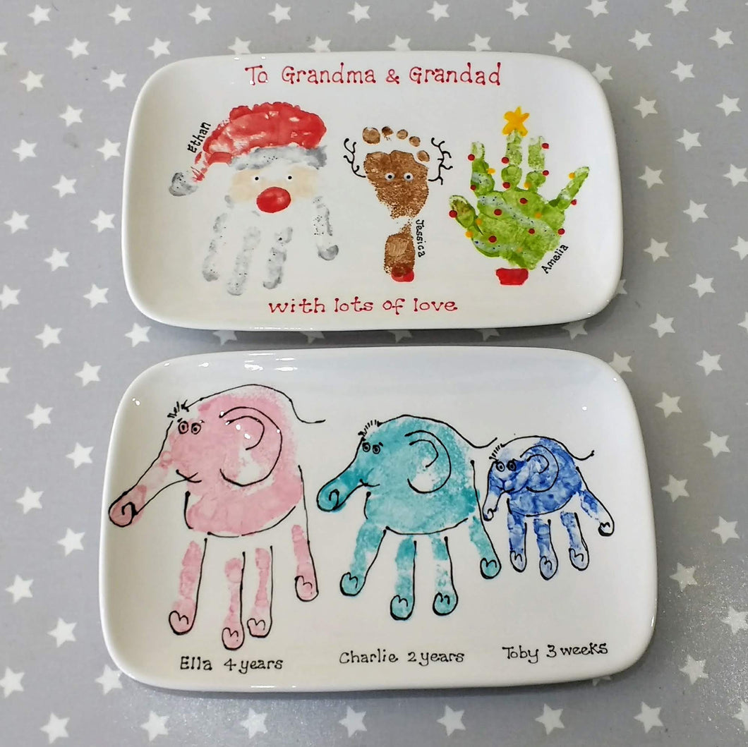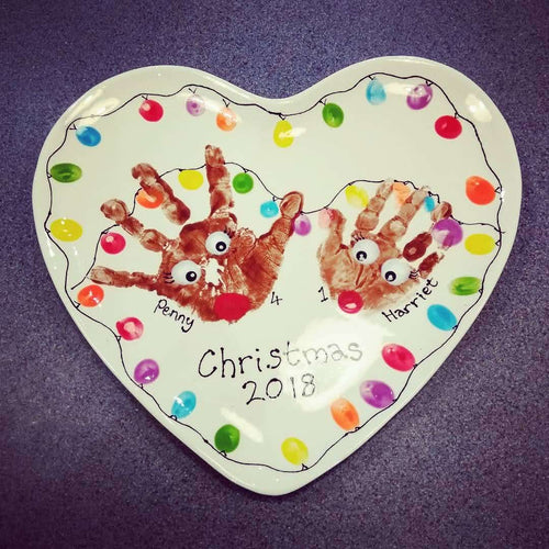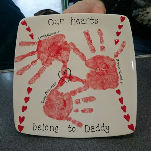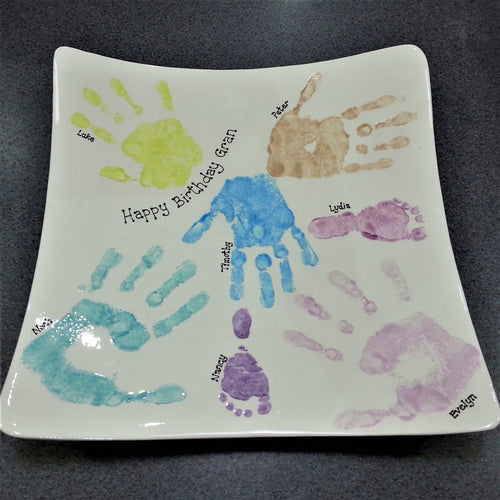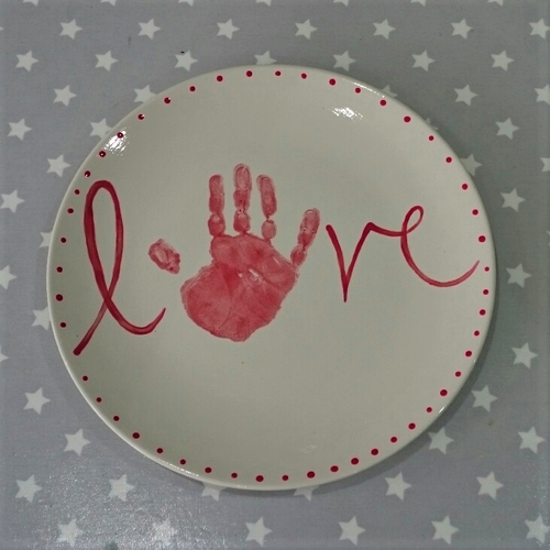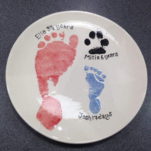 We have so many different pottery pieces suitable for hand and footprints. We can take prints on functional pieces like mugs, plates, bowls, jugs, vases etc. or decorative pieces like plaques, tiles, photo frames and decorations. We have such a wide range of different sized pottery pieces we can accommodate anything from a single footprint, right up to handprints of the whole family.