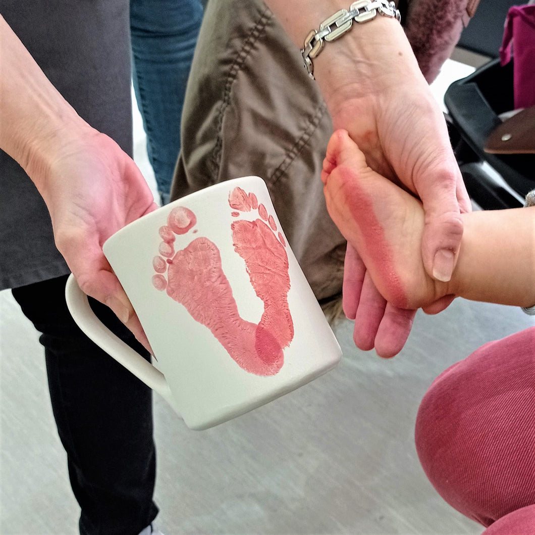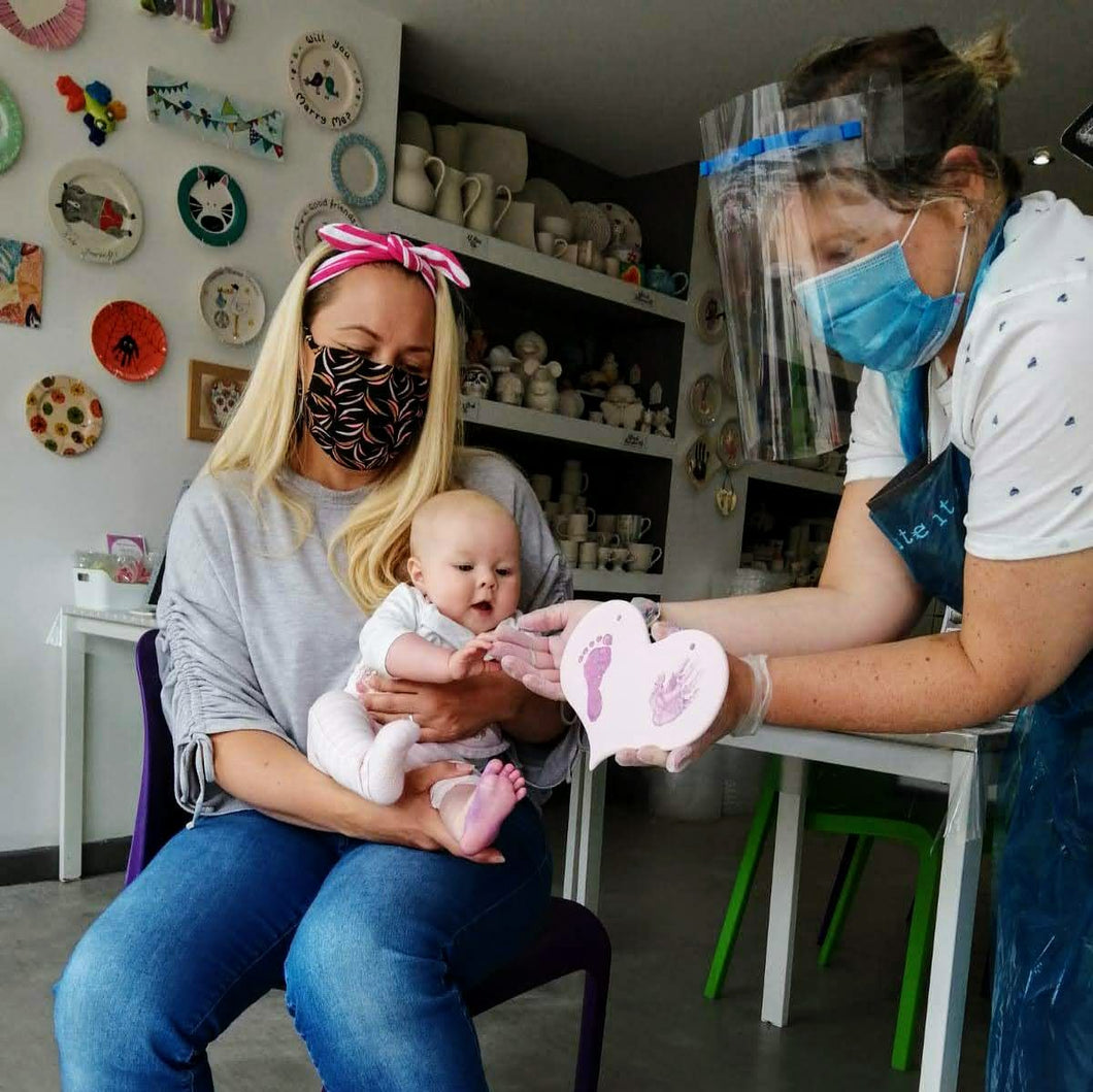 You can rest assured that the safety of our customers and staff is top priority. The underglaze colours we use are water based and non-toxic so super safe for little hands and feet. And we always have a baby wipe on hand for a quick clean up once the prints have been taken.